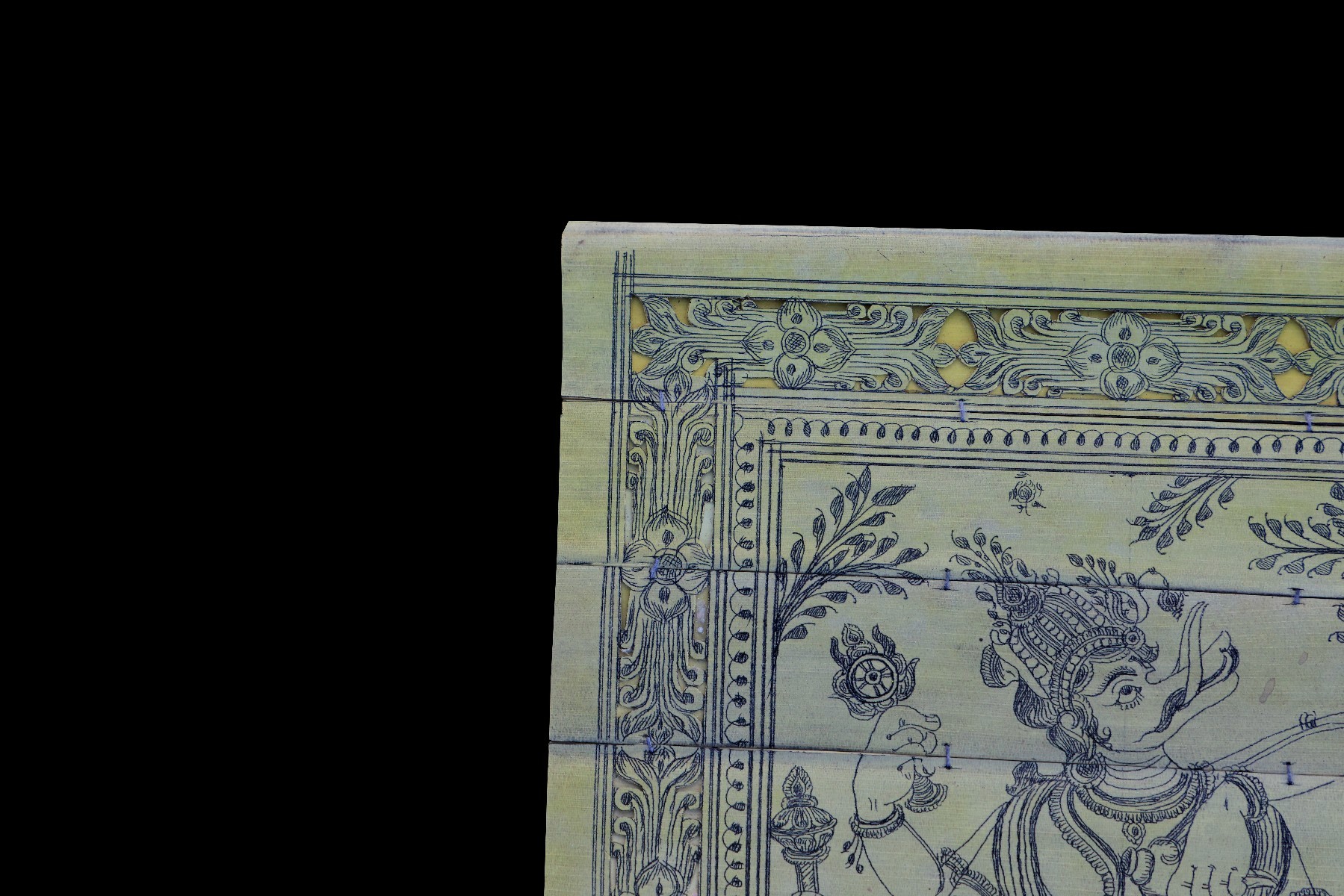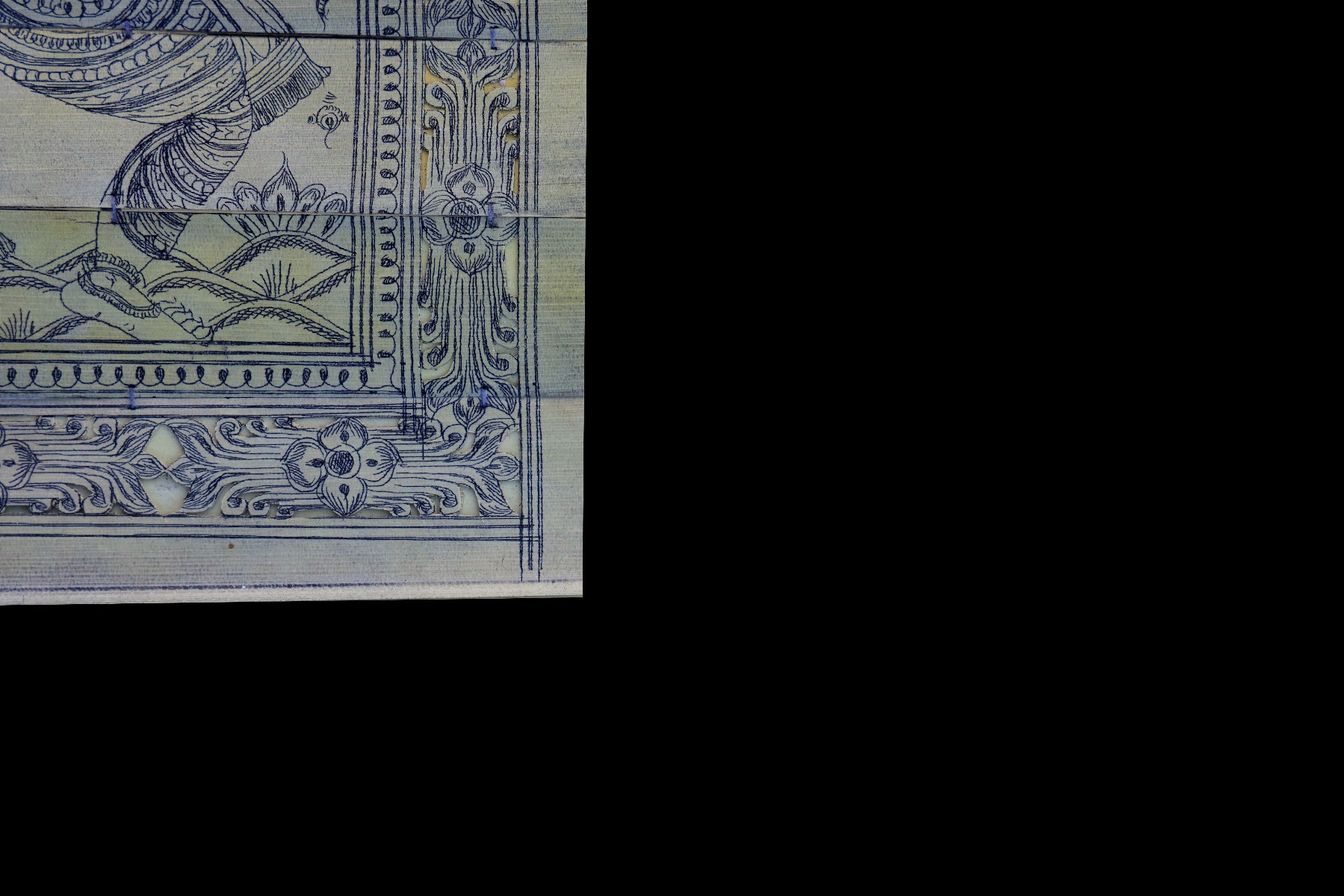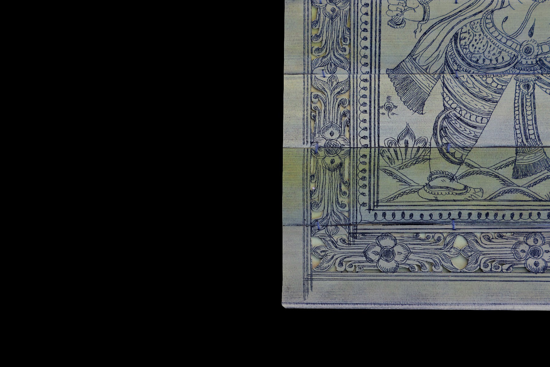 Palm-leaf works are among the rarest surviving formats of narrative art In Baraha Avatar, Vishnu rises not in spectacle but in resolve—mid-stride, grounded, unwavering. Etched into palm leaf with unwavering precision, the form carries a rare stillness: strength held in balance, power expressed through restraint. The lines feel almost whispered, yet they endure—much like the story they hold.