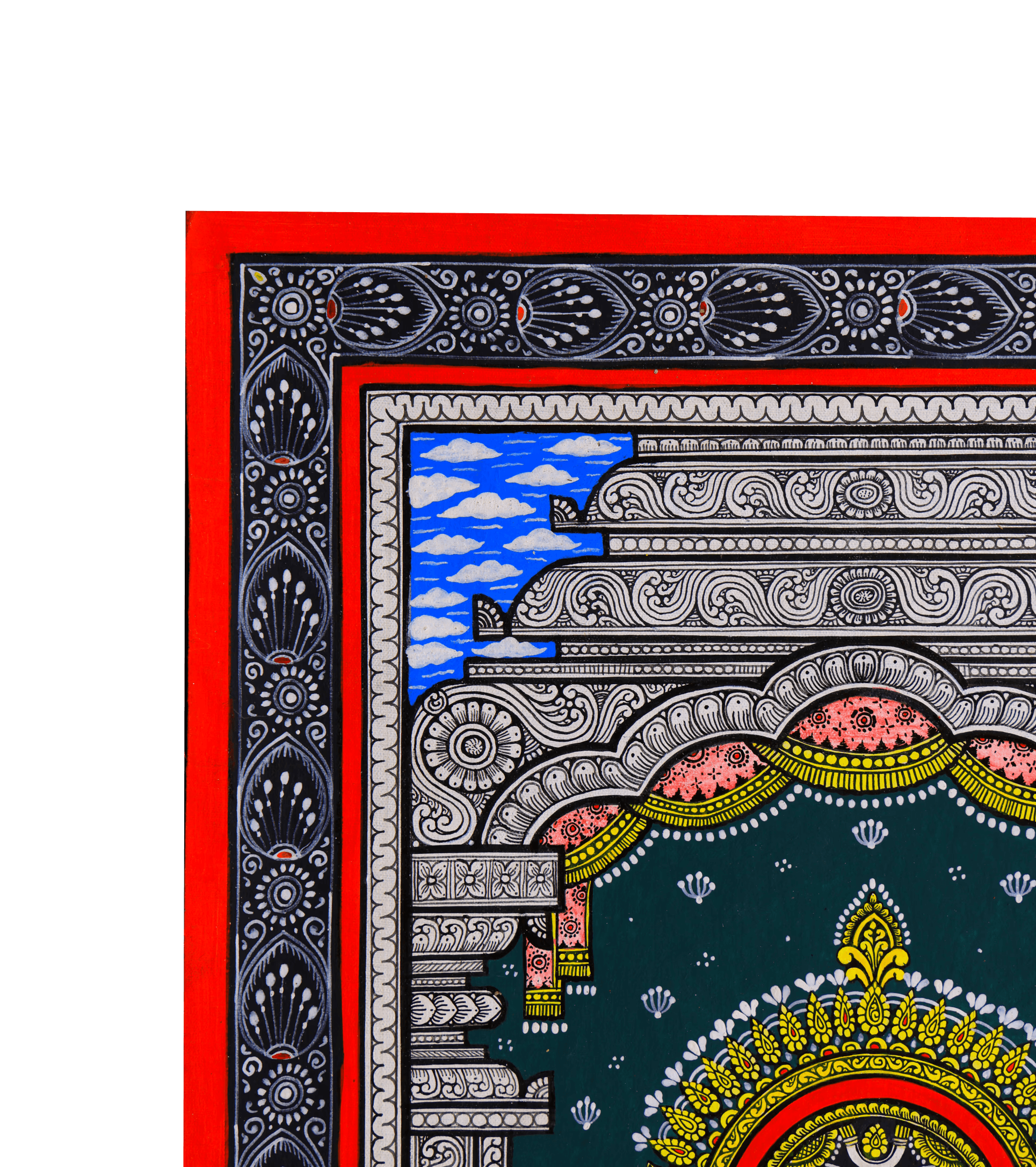 Unlike narrative scenes that prioritize movement, this work emphasizes controlled symmetry and balance. Fine linear patterns articulate the crown, facial markings, jewelry, and architectural borders, requiring sustained concentration and steady hand control. Each decorative element is executed individually, resulting in a surface that feels intricately woven rather than mechanically repeated.