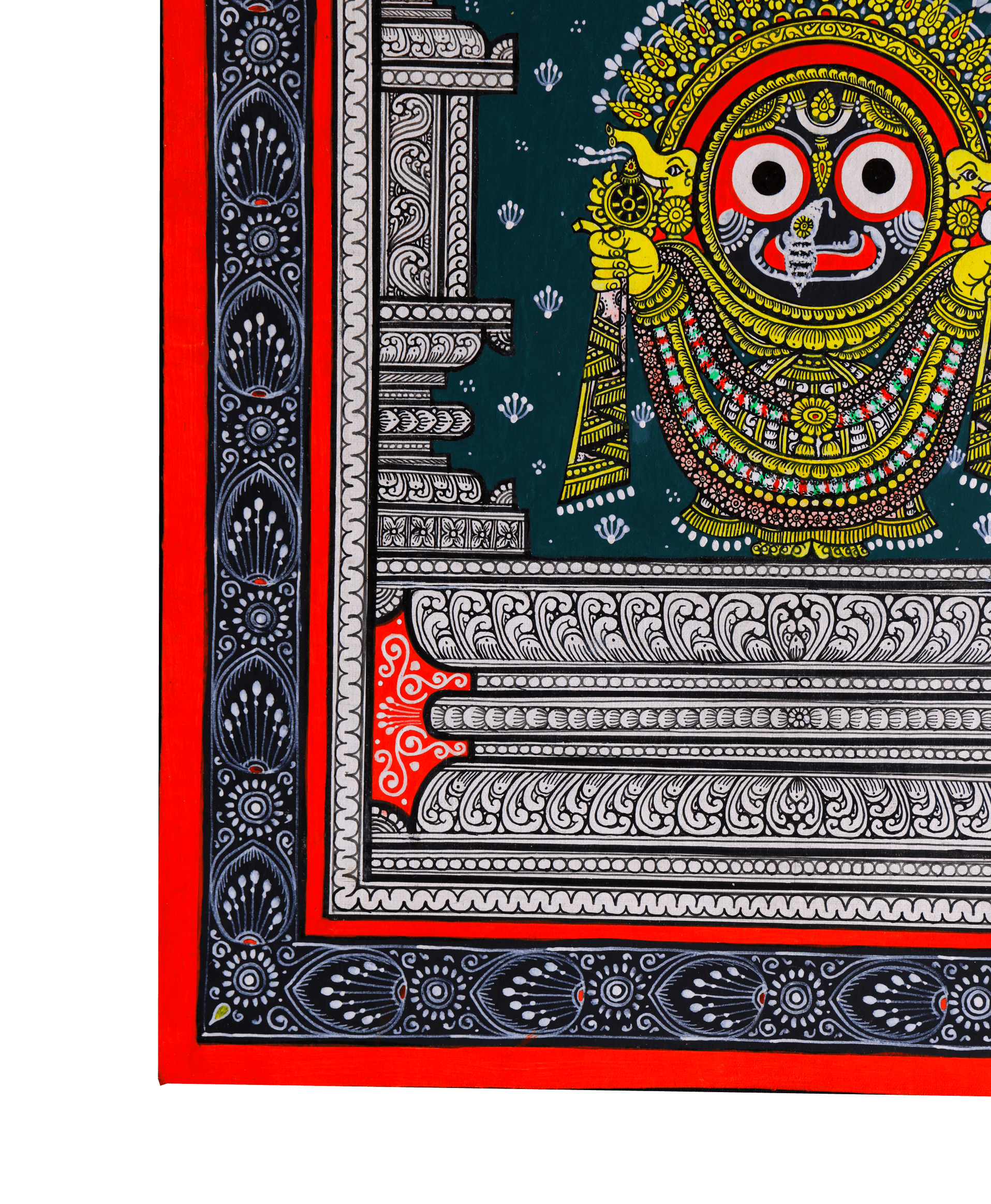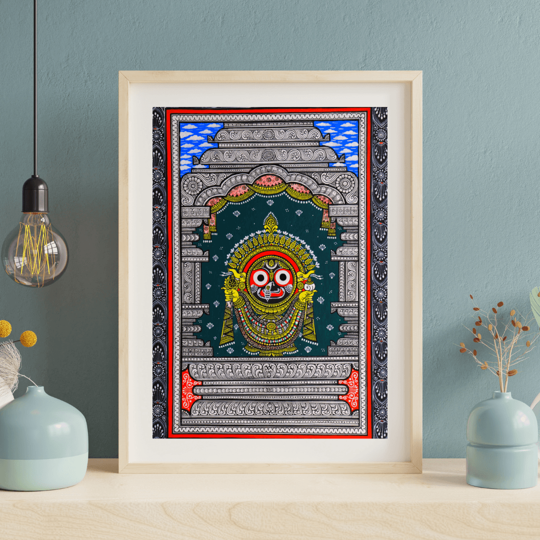 This portrait of Lord Jagannath centers on presence rather than narrative. Rendered in a frontal, iconic format, the composition evokes darshan — the act of sacred seeing — where the viewer encounters the deity not as a character in a story, but as a living presence. The calm symmetry, luminous ornamentation, and steady gaze create an image meant for contemplation, anchoring spiritual intimacy within a richly patterned visual field.