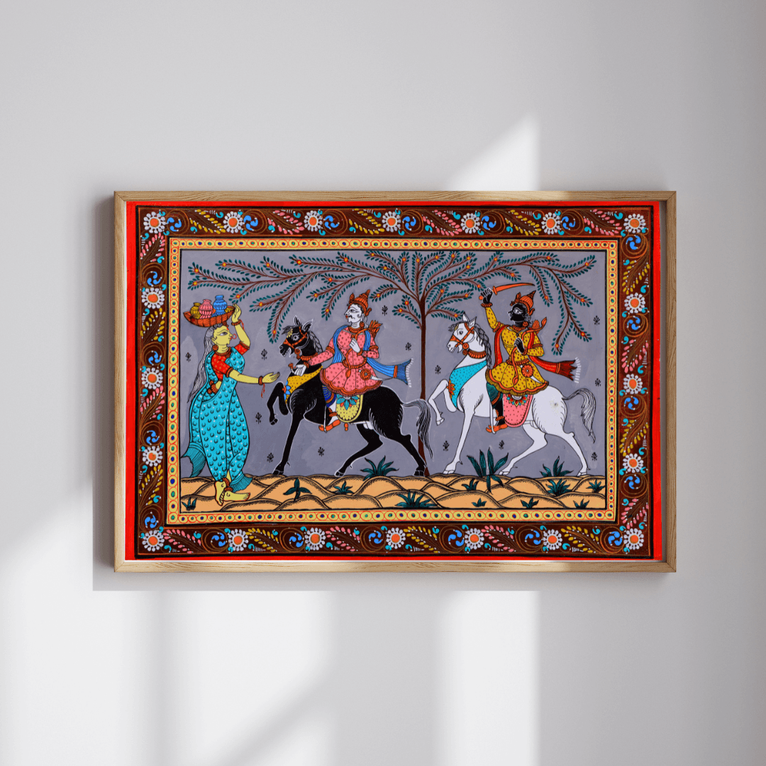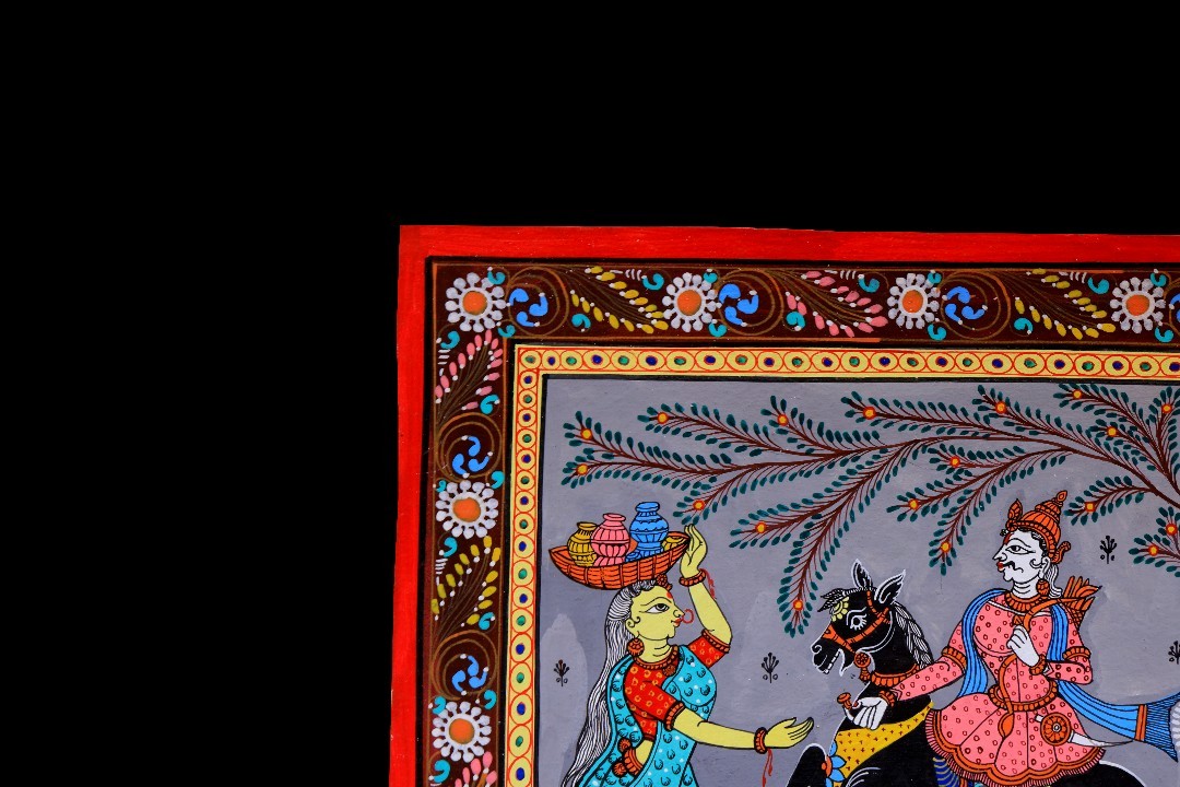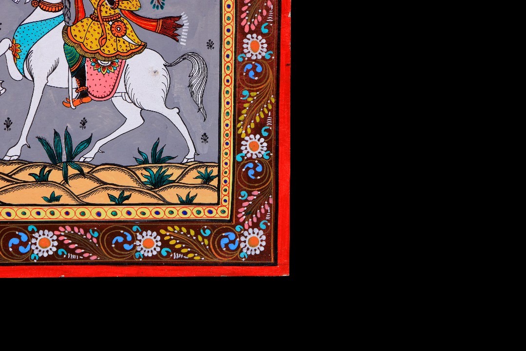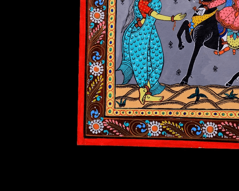 The artwork is composed using traditional Pattachitra methods, beginning with fine freehand black line drawing to define figures, horses, foliage, and decorative borders. Layered hand-applied pigments build clarity and depth while preserving crisp outlines. Repeating motifs and patterned garments create visual rhythm, guiding the eye across the narrative from left to right. Executed entirely by hand without stencils, the work reflects careful control of proportion, spacing, and movement.