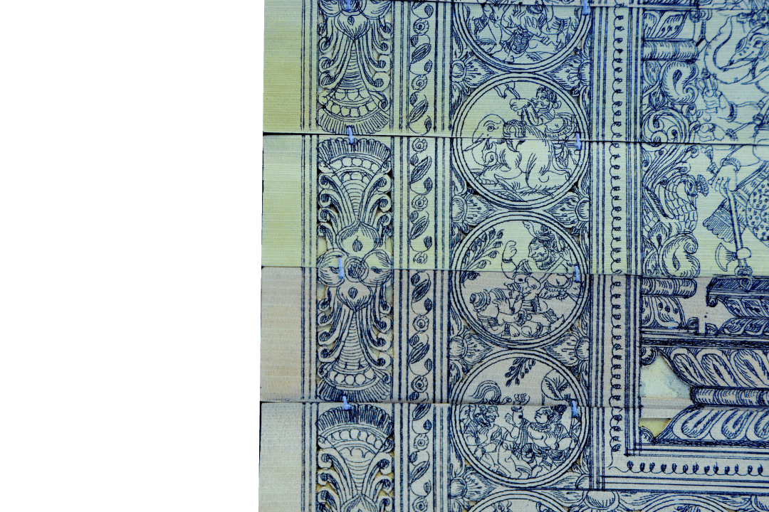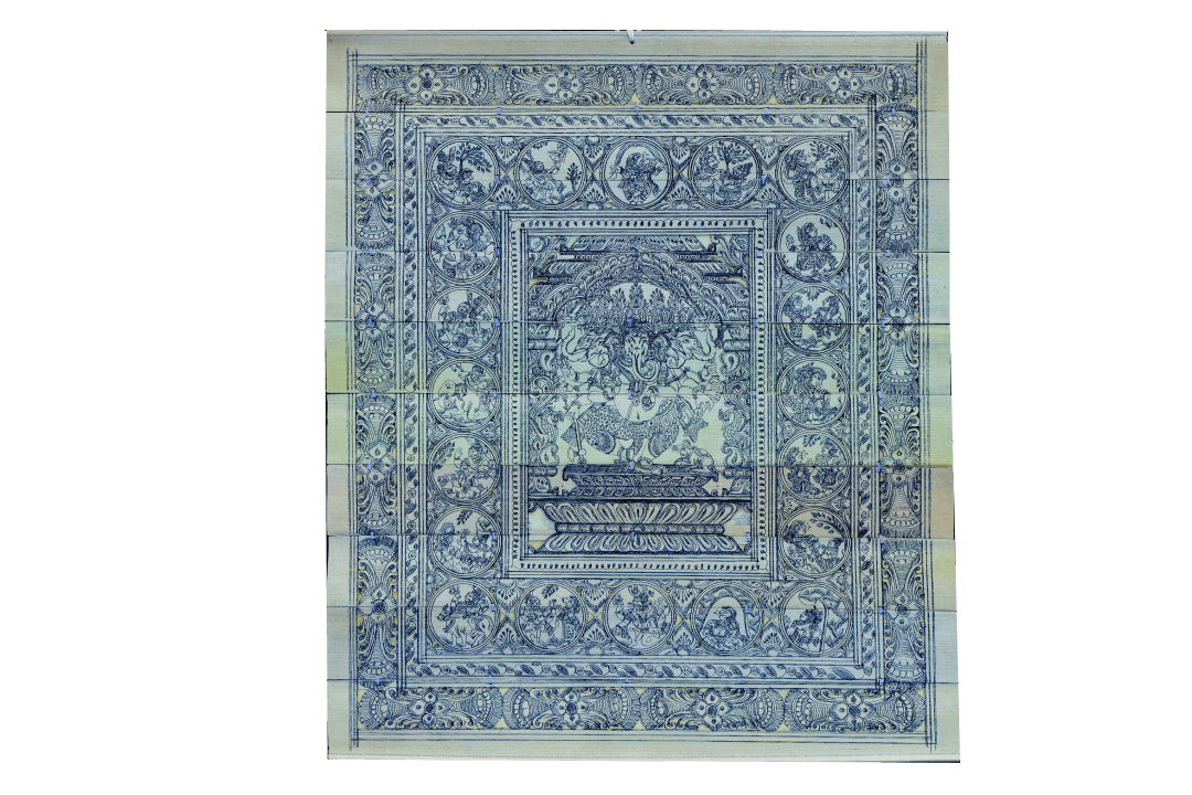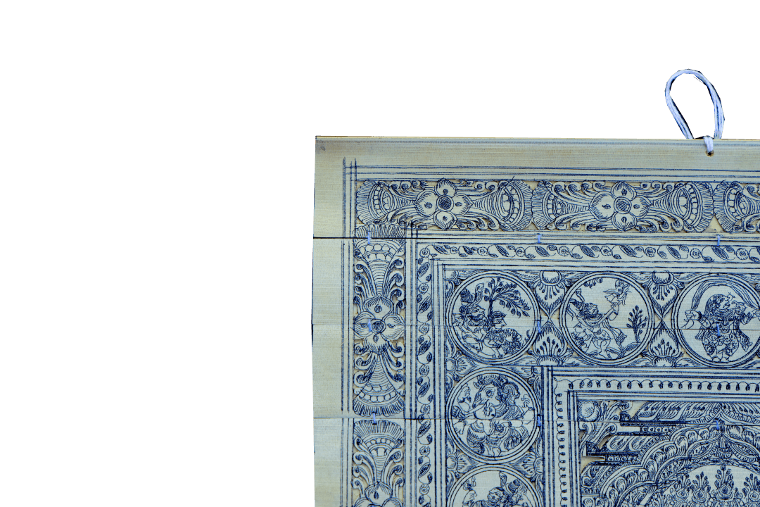 Each line is hand-incised using a metal stylus (Lekhani), where certainty replaces correction. The layered ornamentation and balanced stance speak to a lineage of mastery—where mythology is not merely illustrated, but engraved. At close range, the density of the linework reveals a quiet complexity that rewards lingering attention, pulling the viewer into a world of minute detail and ancient rhythm.