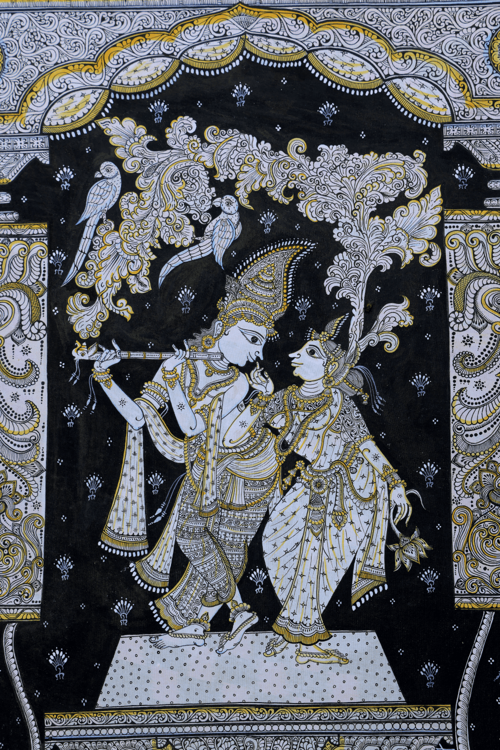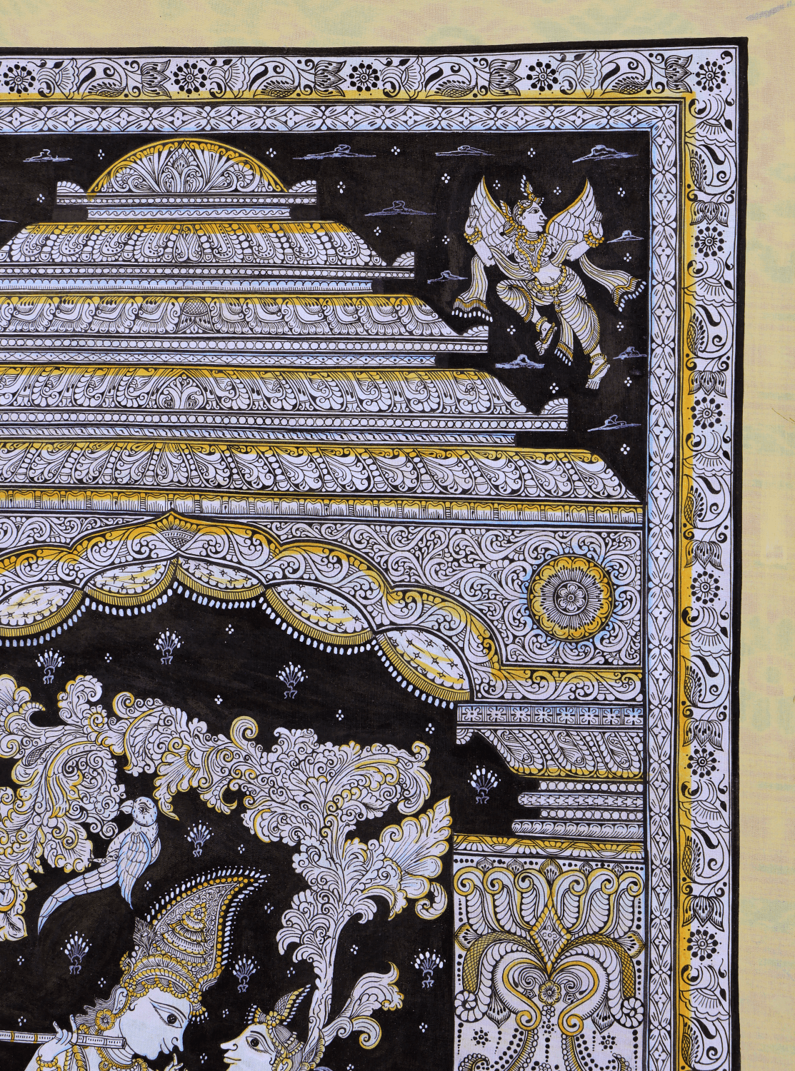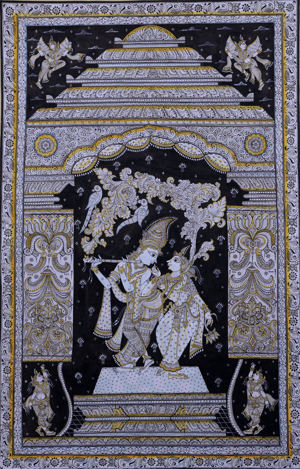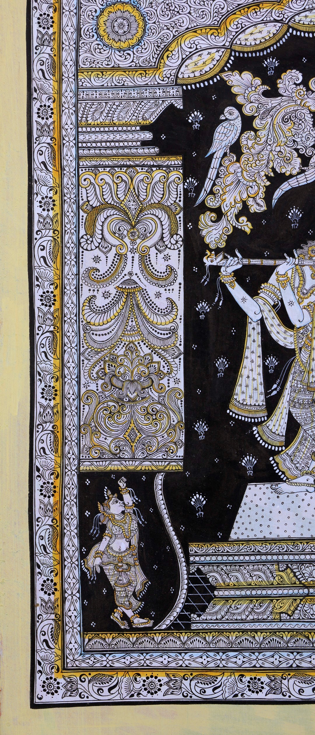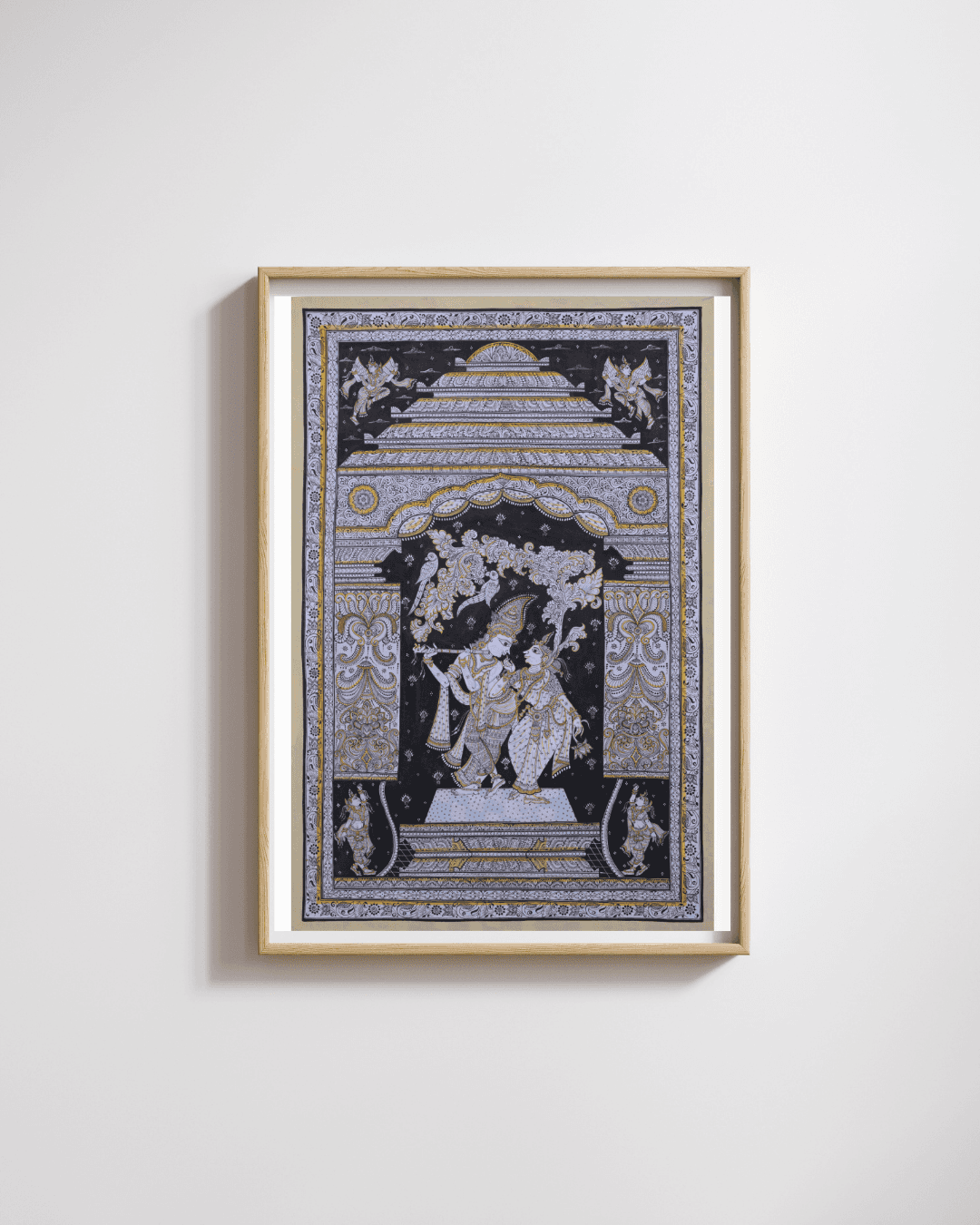 The midnight dance of devotion. Rendered in the difficult Kala-Dala (Black & White) style, this masterwork uses the absence of color to highlight the infinite intricacy of line. A striking, sophisticated anchor for any space This work is priced to reflect its status as a 'Sushma Lekhni' (Fine Line) masterpiece. It features the rarest form of Pattachitra craftsmanship: the 'Kala-Dala' (Monochrome) technique, where the artist uses a single-hair mouse-hair brush to create shading solely through line density. This piece took 175 documented hours to complete and is signed by the artist