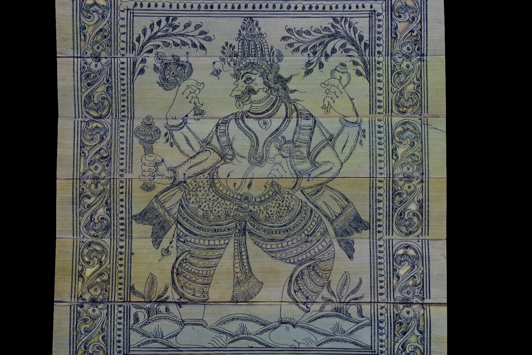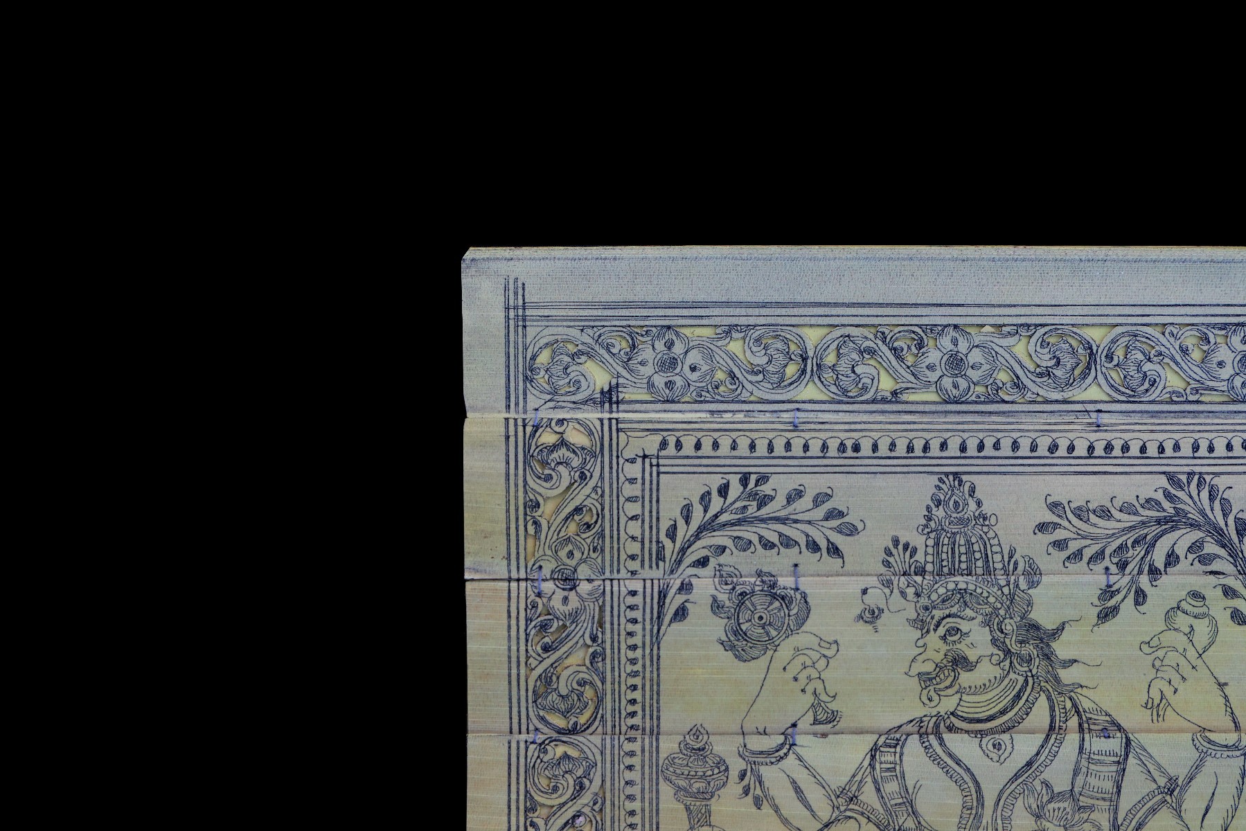 Palm-leaf works are among the rarest surviving formats of narrative art Nṛsiṁha Avatar captures the moment just before thunder breaks—power held in poise. Neither fully man nor lion, the form stands mid-movement, carved with deliberate restraint. The energy is unmistakable, yet disciplined, as if the palm leaf itself is holding its breath. This is ferocity rendered through patience.