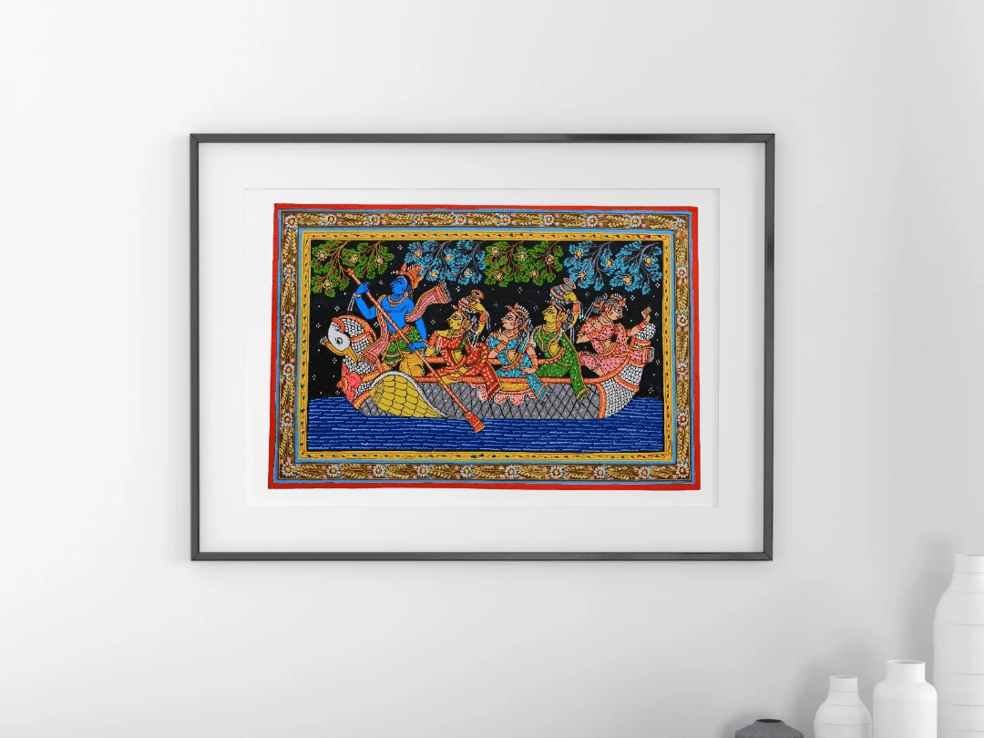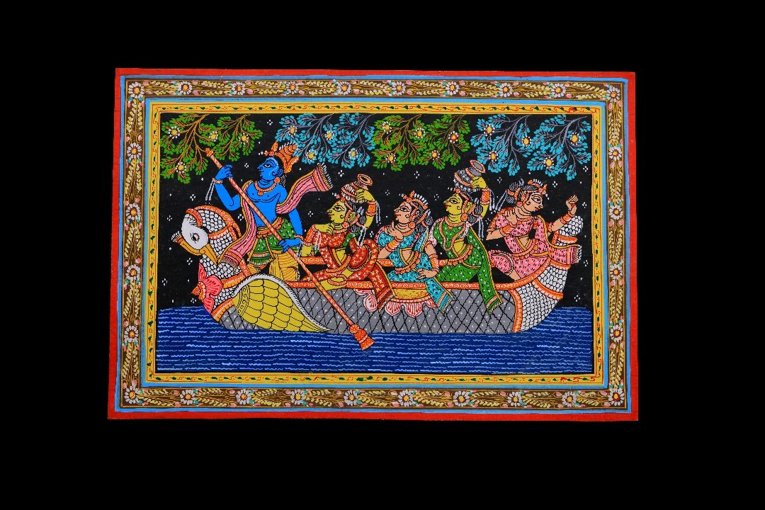 Executed in the classical Pattachitra tradition, the work is defined by disciplined line work and narrative balance. Figures are rendered with fine, deliberate strokes, their garments and ornaments filled with intricate patterns that echo the flow of water and song. The elongated horizontal format enhances the sense of travel, while the ornamental border anchors the composition with visual symmetry.