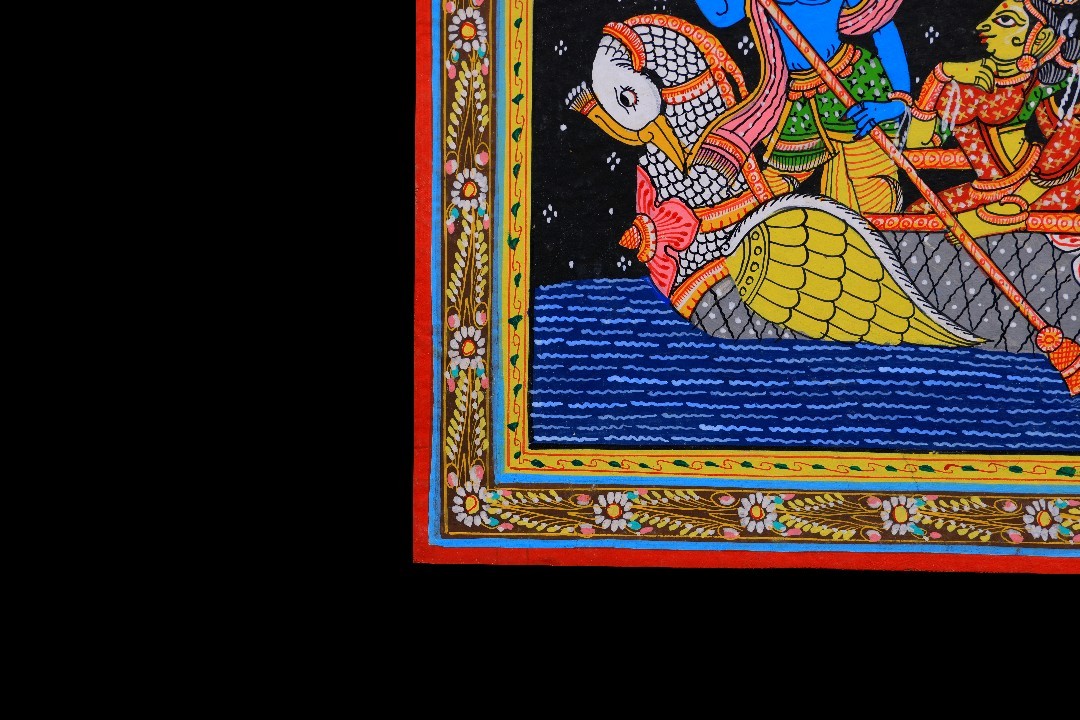 Painted on handmade patta—a traditional cloth prepared through layered treatment for strength and longevity. Natural and mineral pigments are hand-mixed and applied in careful layers, producing deep blacks and luminous jewel tones. The surface preserves exceptional clarity, allowing fine details to remain visible even at close view.